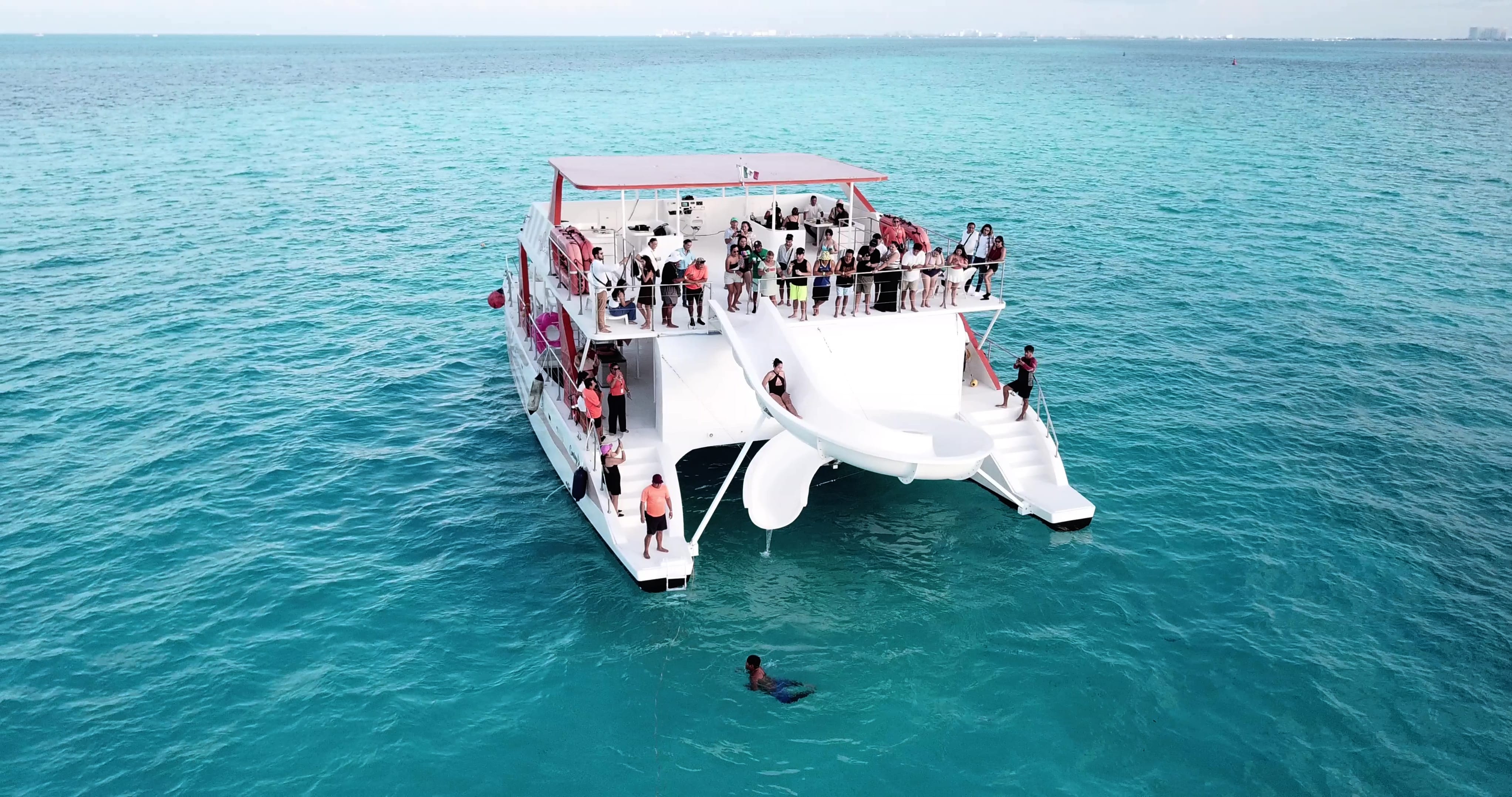 Sail, snorkel, and party aboard a fun-filled catamaran in Cancún! Enjoy open bar, water slide, trampoline, lunch, and shared transfers—perfect for friends, families, and wedding groups